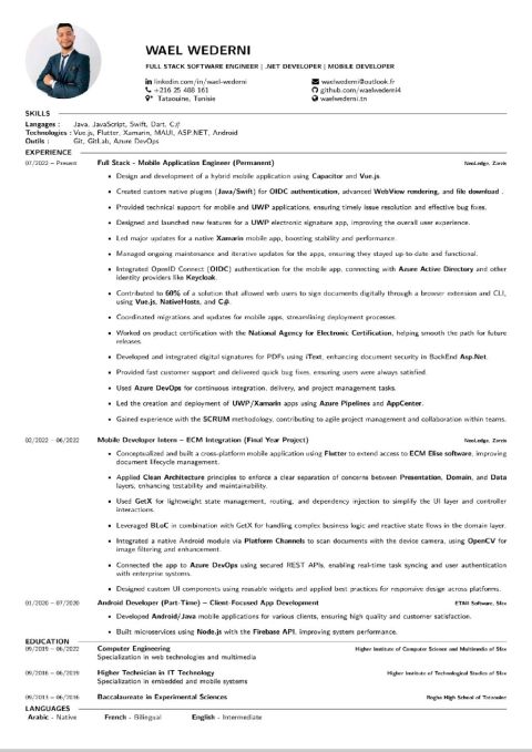Full - Stack Engineer with 4 years’ experience in web and mobile development using Vue. js, Android, MAUI, Xamarin, Flutter, and. NET. Mobile Lead overseeing architecture, standards, mentoring, and deployments. Skilled in building scalable, secure systems and driving innovation through agile methods and CI/ CD. For more info, visit waelwederni. tn