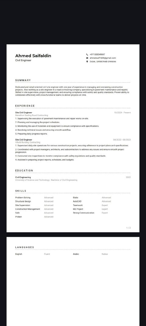 مهندس مدني خبرة أكثر من سنة ونصف داخل دبي والشارقة معيا تصنيف الشارقة فئة خامسه (مقاولات) متمكن في حصر الكميات والشوب دروينج والتخطيط وإدارة الموقع معي رخصة قيادة مصريه