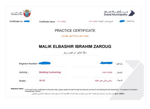 A civil engineer had Dubai Municipality Practice Certificate Contracting G 12 search for classification in Dubai, all documents are ready