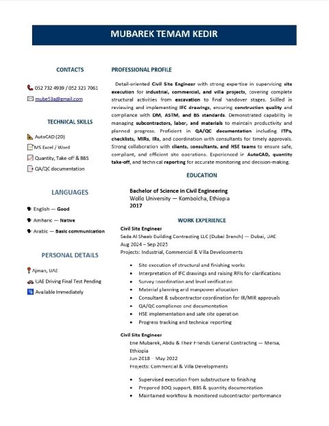Civil Engineer with 12 years of experience, including 5 years in Dubai. Managed and executed villa projects and G 10 buildings, with Dubai G 12 classification. Skilled in site supervision, contractor coordination, and quality control. Holder of Abu Dhabi Registered Engineer (Practitioner) Seeking a role as Site/ Project Engineer available to join within one month