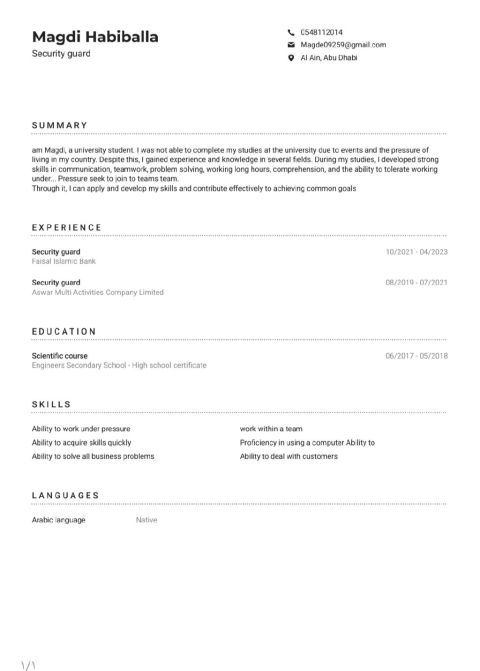 أنا مجدي شاب سوداني 24 سنة متواجد داخل الامارات ابحث عن وظيفة حارس أمن ولدي شهادة خبرة سنتين في المجال