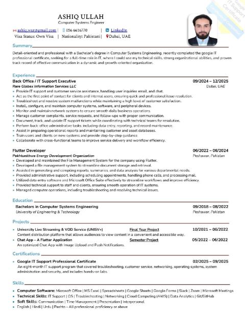 A well organized and experienced IT Engineer, looking for any suitable job opportunity in UAE. A Pakistani national available to join immediately. Attach is my resume for further details. Thanks in advance