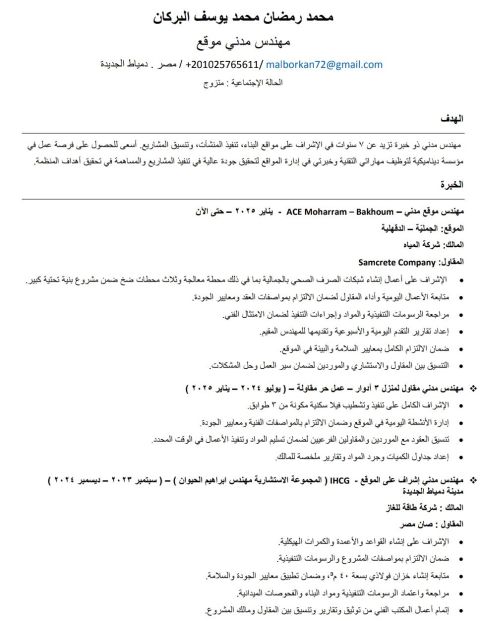 مهندس مدني موقع خبرة أكثر من 7 سنوات في الاشراف والتنفيذ، أملك خبرات عمل مختلفة كمهندس موقع بالمشروعات الانشائية، البنية التحتية، ومشروعات الموانئ (مباني وأبراج سكنية - فلل - محطات - شبكات - أرصفة ومرافق) اجادة التعامل مع الرسومات، متابعة الأعمال، ضبط الجودة والسلامة، والتنسيق مع المقاولين والاستشاريين، وإدارة المشروعات. متواجد حاليا داخل مصر ومستعد للعمل في أي مكان