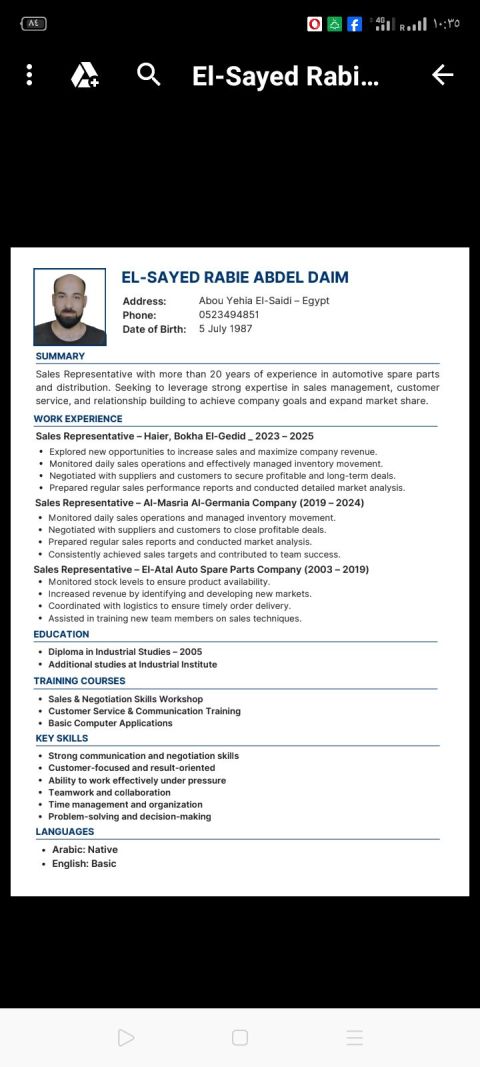 I work as a sales representative for a German modern lighting company and also for Carrefour Egypt hypermarkets. I am looking for a job and want to join immediately
