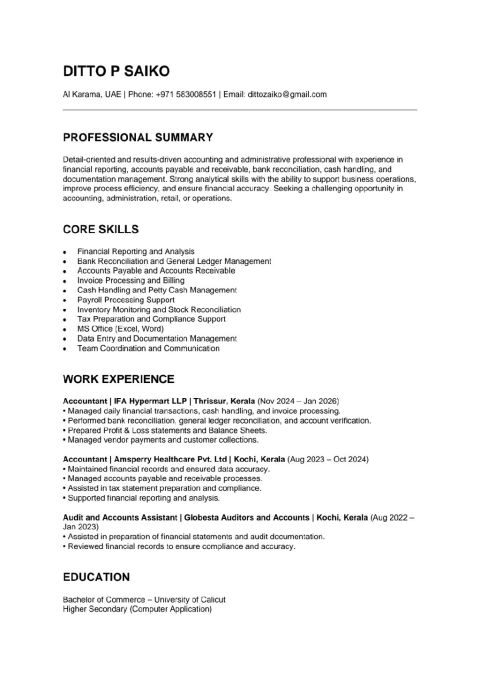 My name is Ditto P Saiko, and I am currently seeking an opportunity as a Junior Accountant in the UAE. I am a fresher in the UAE job market but have accounting experience in India. I have knowledge in Accounts Payable, Accounts Receivable, invoice verification, billing processes, and accurate data entry. I am eager to start my career in the UAE and contribute to your organization while improving