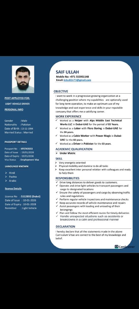 Assalam o alaikum Sir/ Madam I am a professional Light vehicle driver looking for a driver job I have Experience More in UAE. I have visa With NOC I can join immedietly please let me know if have any vacancy