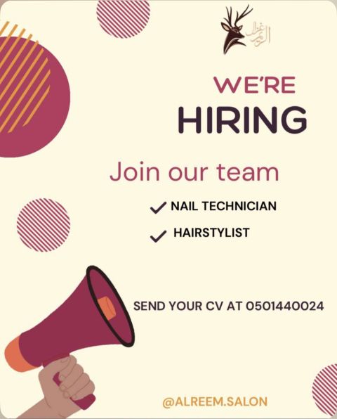 انضم الى فريقنا ما نبحث عنه فن الاظافر، وصلات الاظافر، تسريحات الشعر. شخصية ودودة وجذابة تسعد الجميع. فريق عمل مبدع يزدهر في بيئة ايجابية وحيوية، ويحرص على مشاركة معارفه ومهاراته. ما نقدمه رواتب تنافسية وجداول عمل مرنة. بيئة عمل داعمة وملهمة تمكن إبداعك من النمو. تدريب وتعليم مستمران