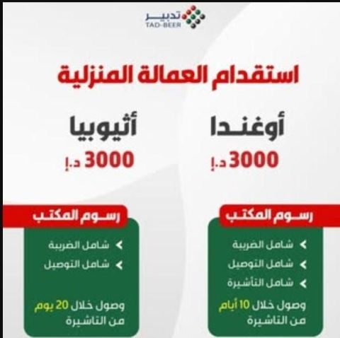 وفرنا لكم عمالة منزلية مدربة من اثيوبيا طلبات أول مرة وصول خلال 10 أيام فقط 3800 درهم طلبات خبرة 4500 داخل الدولة بالمركز 5250 أوغندا فقط ب 2999 درهم متوفر مدرسات وممرضات مع لايسنس ضمان تدبير سنتين استبدال العاملة العندكم بعمالة جديدة مقابل 1000 درهم فقط العرض ساري لمدة 5 أيام فقط لا تفوتوا الفرصة للحجز والاستفسار