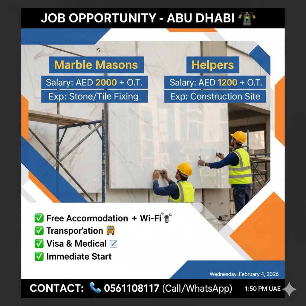 Hiring Marble Masons & Helpers (Abu Dhabi - Mussafah) 1. Marble Masons AED2000 + Overtime 2. Helpers AED1200 + Overtime Benefits Free Accommodation + High - Speed WiFi - Free Transportation Employment Visa & Medical Insurance Immediate Start Requirements Must be inside UAE. Experience in marble/ stone fixing. Contact (WhatsApp/ Call)