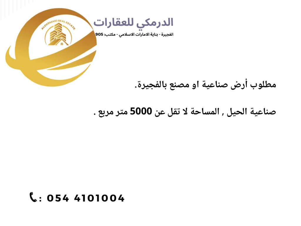 مطلوب للإيجار أرض صناعية أو مصنع في الفجيرة صناعية الحيل، المساحة لا تقل عن 8000 ألاف متر مربع