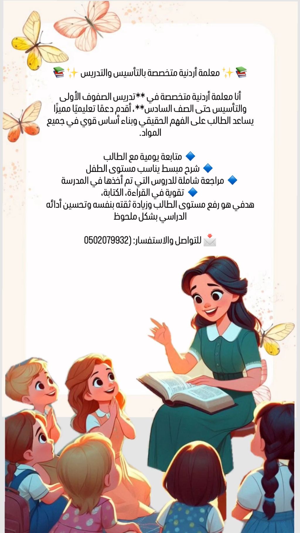 معلمة أردنية متخصصة بالتأسيس والتدريس أنا معلمة أردنية متخصصة في تدريس الصفوف الأولى والتأسيس حتى الصف السادس أقدم دعما تعليميا مميز يساعد الطالب على الفهم الحقيقي وبناء أساس قوي في جميع المواد. للتواصل والاستفسار