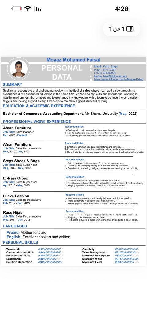 محترف مبيعات وتسويق بخبرة متعددة في التلي سيلز، السوشيال ميديا، والمجال السياحي. امتلك سجلا قويا في رفع نسب المبيعات، جذب عملاء جدد، وتحسين صورة البراند اونلاين. أسعى للانضمام الى شركة طموحة أكون فيها اضافة حقيقية وأحقق نموا مستداما