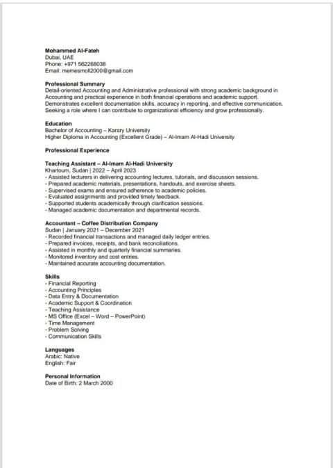 أنا محمد الفاتح سوداني الجنسية خريج جامعة كرري كلية العلوم الادارية تخصص إدارة أعمال وحصلت على دبلوم عالي في المحاسبه أفضل العمل في المجال الاداري أو مساعد محاسب وجميع المجالات الادارية بالأخص المبيعات