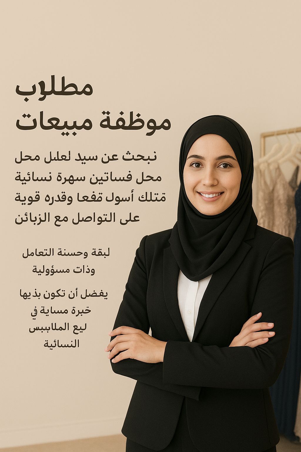 مطلوب موظفة مبيعات للعمل في محل فساتين سهرة نسائية. تمتلك أسلوبا مقنعا وقدرة قوية على التواصل مع الزبائن لبقة وحسنة التعامل وذات مسؤولية يفضل أن تكون لديها خبرة سابقة في مجال بيع الملابس النسائية. كورنيش