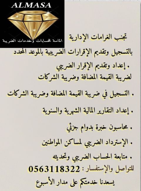 جميع التسجيلات الضريبيه وتقديم الاقرارات وخدمات التدقيق في مكتبنا بأقل سعر مع أمهر متخصصين