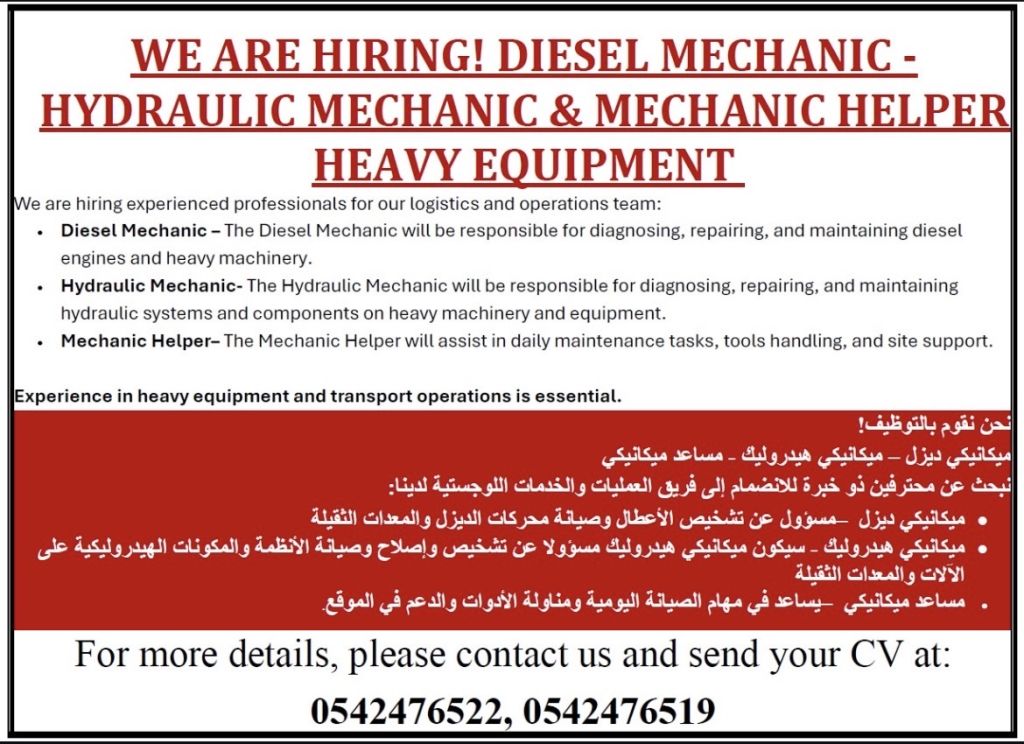 نحن نقوم بتوظيف ميكانيكي ديزل في إمارة الفجيرة - الثوبان الصناعية مسؤول عن تشخيص الأعطال وصيانة محركات الديزل والمعدات الثقيلة ميكانيكي هيدروليك مسؤولا عن تشخيص واصلاح وصيانة الأنظمة والمكونات الهيدروليكية على الآلات والمعدات الثقيلة - مساعد ميكانيكي يساعد في مهام الصيانة اليومية ومناولة الأدوات والدعم في الموقع