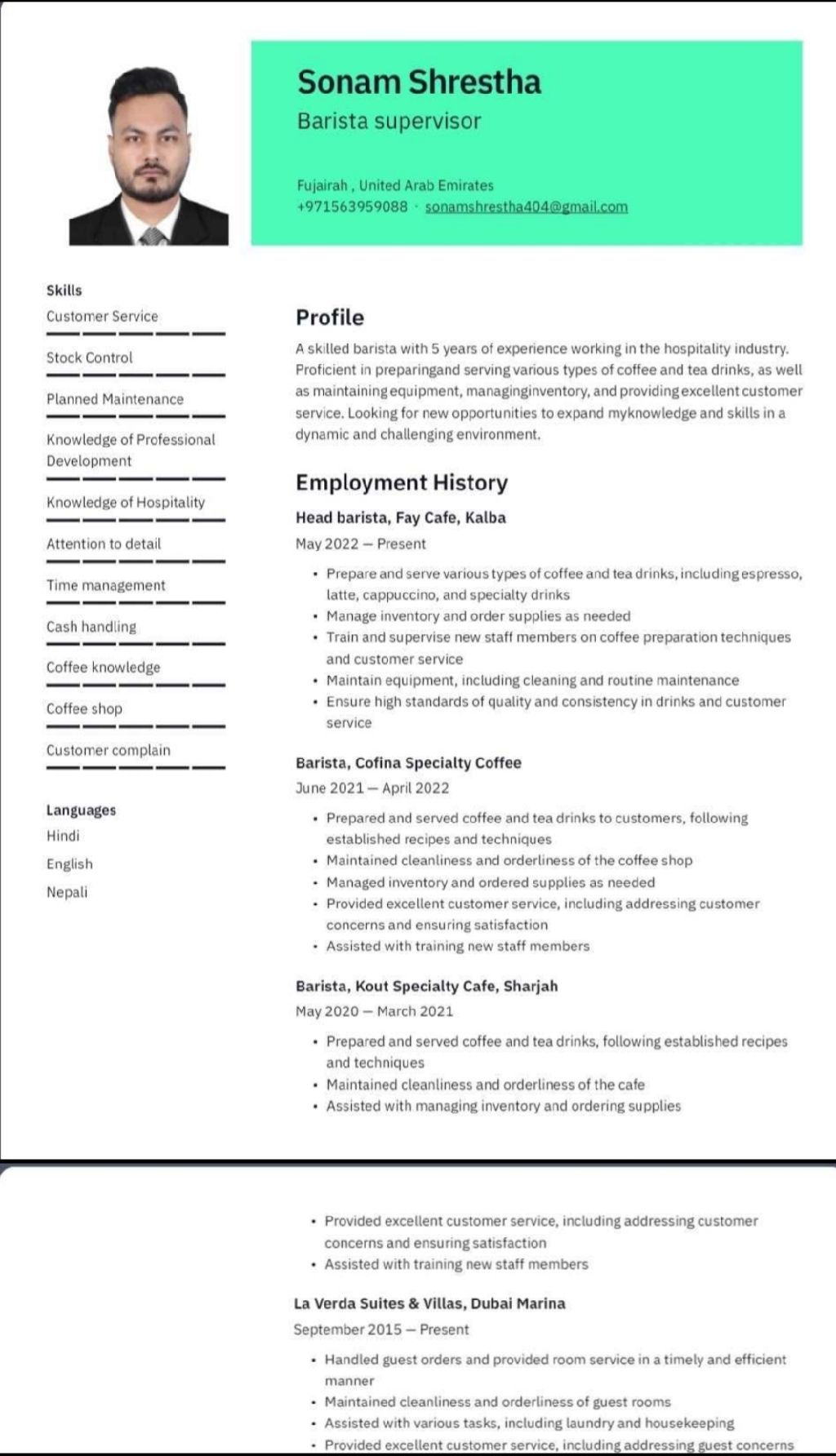 Hi I am experience in specialty coffee Barista/ supervisor if you have any vacancy in Fujairah Kalba only please feel free to contact I can immediately join