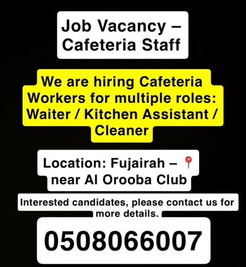 Job Vacancy - Cafeteria Staff We are hiring Cafeteria Workers for multiple roles Waiter/ Kitchen Assistant/ Cleaner Location Fujairah - near Al Orooba Club Interested candidates, please contact us for more details