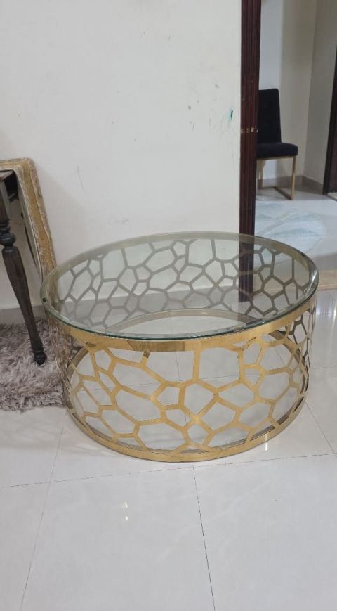 Sofa table gold with glass, 1m diameter, in RAK price 150 dirhams, and silver table price 150 dirhams