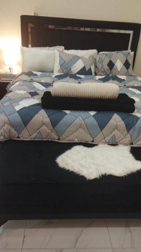 سرير بحالة جيدة تفصيل وستائر للبيع مع 2 كمودينوا أيضا بحالة الجديد وأيضا سرير ميكب جديد لم يستخدم