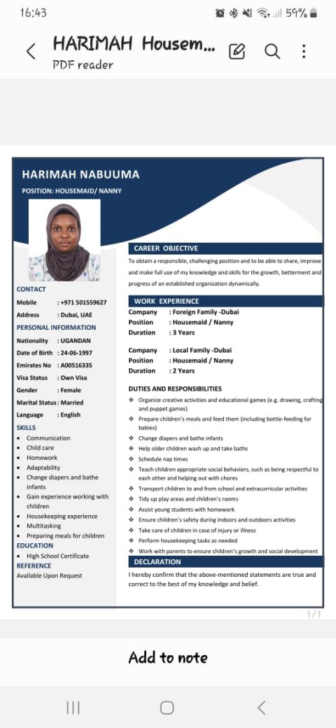 Am shifah Namayega from Uganda looking for a nanny/ maid job with 5 years experience here in Dubai. 2 years in a local family and 3 years with an Australian family taking care of 2 children. I am a patient calm flexible and reliable person. I am a self driven person who give attention to details. I can give reference upon request
