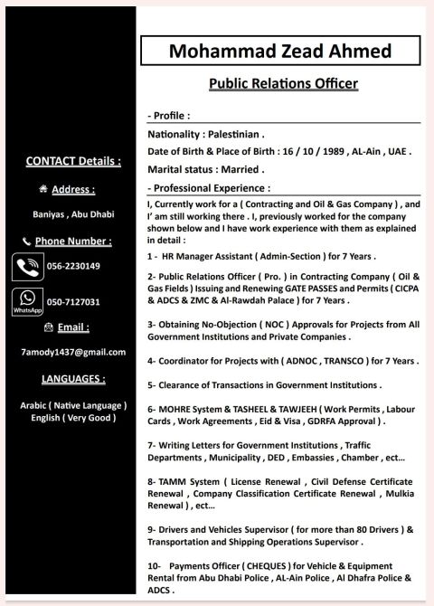 الخبرة المهنية 1 - مساعد مدير الموارد البشرية (قسم الإدارة) لمدة 7 سنوات. 2 - موظف علاقات عامة في شركة مقاولات (حقول النفط والغاز) CICPA وشرطة أبوظبي ودبي ومدينة زايد العسكرية وقصر الروضة) لمدة 7 سنوات. 3 - الحصول على موافقات عدم الممانعة للمشاريع من كافة المؤسسات الحكومية والشركات الخاصة. 4 - منسق مشاريع مع (أدنوك، ترانسكو) لمدة 7 سنوات. 5 - تخليص معاملات في المؤسسات الحكومية. وغيرها من الأعمال