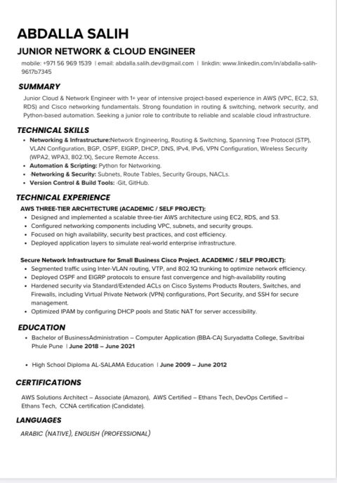 أنا عبدالله سوداني الجنسية مهندس تقنية معلومات متخصص في الشبكات والحوسبة السحابية AWS، مقيم حاليا في أبوظبي، وابحث عن فرصة عمل مناسبة أستطيع من خلالها توظيف مهاراتي التقنية والمساهمة في تطوير البنية التحتية الرقمية للمؤسسة