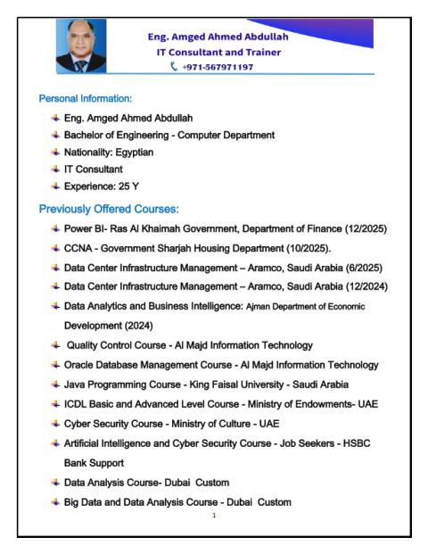 مهندس كمبيوتر خبرة 30 عام في مجال تكنولوجيا المعلومات محاضر ومستشار تدريب في مجال تكنولوجيا المعلومات في العديد من القطاعات الحكومية في دولة الامارات مهندس متخصص في إدارة الشبكات