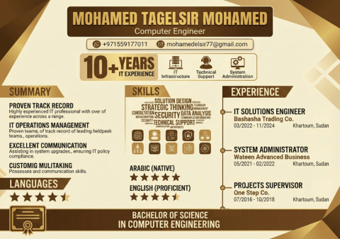 I am a Network and IT Engineer with over 10 years of experience, possessing strong skills in Network design and management. Information security. Systems admin and technical support. Proficiency with Windows Server. Experience with IP Phones and CCTV systems. PC maintenance and troubleshooting. Attendance systems management. Currently based in the UAE, I am eager to discuss any job opportunity