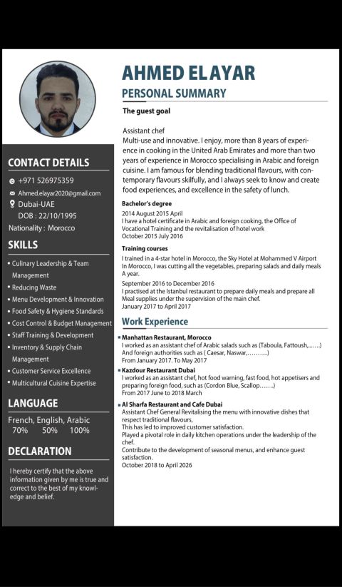 العمر 27 سنة المؤهلات خبرة 6 سنين داخل الدولة حاصل على رخصة قيادة اماراتية متوفر اقامة قابلة للإعارة خبرة سنتين بالكاشير وثلاثة سنة مبيعات وتعامل مع الزبائن وسنة كاملة توصيل طلبات بالاضافة لاتقان اللغة الانجليزية وخبرة بادارة المشاريع والتعامل مع الحاسوب