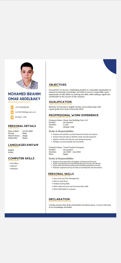 محاسب خبرة سنتين داخل الامارات بشركة مقاولات وأحمل رخصة قيادة اماراتية ابحث عن فرصة عمل