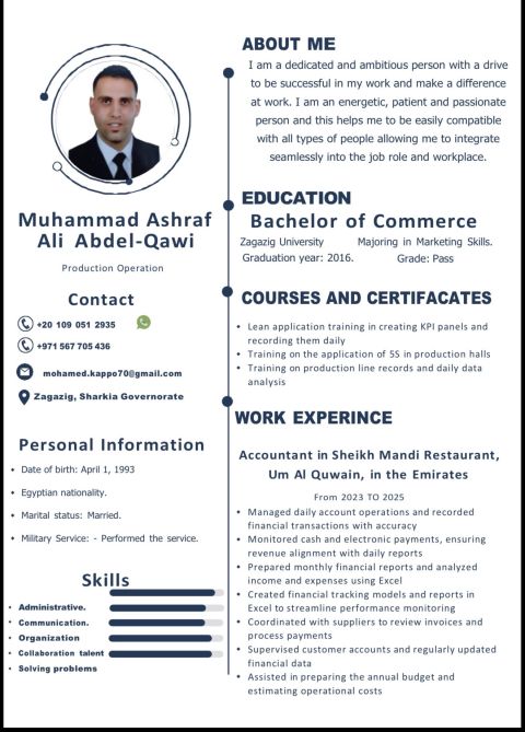 اسمي محمد أشرف مصري الجنسية عندي 32 سنة حاصل علي بكالوريوس تجارة، خبرة أكثر من 10 سنوات في التخطيط وتحليل البيانات، وإدارة الانتاج في شركات مستحضرات التجميل، بالاضافة الى خبرة في الحسابات والعمل بالمطاعم داخل الامارات. متمكن من برامج الكمبيوتر وExcel واعداد التقارير، ولدي خبرة قوية في تنظيم البيانات، المتابعة، والعمل تحت الضغط. ابحث عن فرصة ادارية أو تشغيلية مناسبة