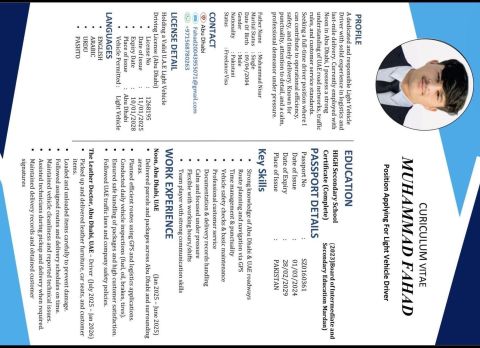 My name is Muhammad Fahad. I am from Pakistan, currently on a freelance visa in the UAE, and hold a light vehicle driving license. I am actively looking for driving job opportunities