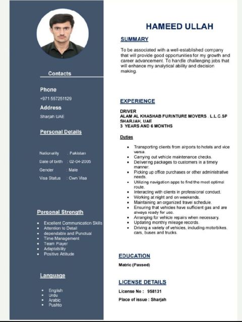 Hi I am Hameedullah From Pakistan Age 20 Years Old I am Looking For a Light Vehicle Driver Job I have 3 Years UAE Driving Experience With Own Visa ID I Speak Arabic English and Urdu Fluently If Anyone Need Driver please call