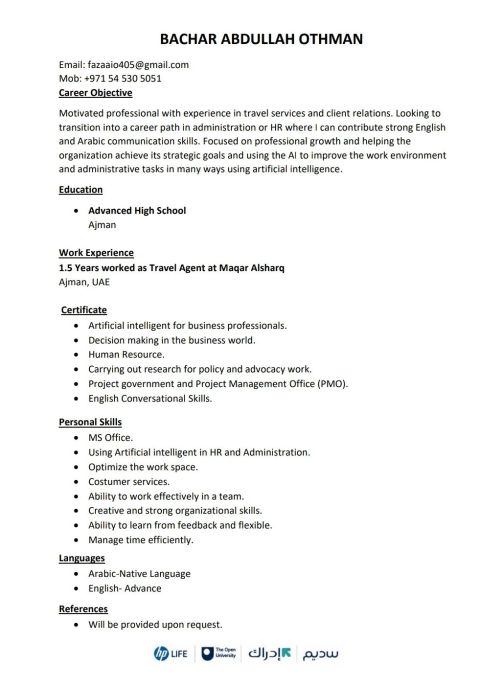 Job seeker based in Abu Dhabi, open to work across UAE. I have experience in public relations and customer service. Fluent in Arabic and English. Strong communication and interpersonal skills, quick learner, and highly adaptable. Available immediately and willing to relocate anywhere in the UAE. Looking for a role where I can contribute and grow professionally
