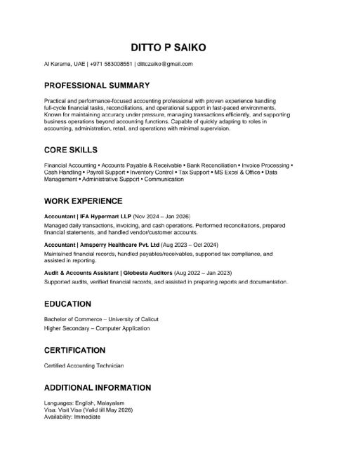 My name is Ditto P Saiko, and I am currently seeking an opportunity as a Junior Accountant in the UAE. I am a fresher in the UAE job market but have accounting experience in India. I have knowledge in Accounts Payable, Accounts Receivable, invoice verification, billing processes, and accurate data entry. I am eager to start my career in the UAE and contribute to your organization while improving