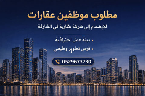 مطلوب موظفين سيلز عقارات للانضمام الى شركة عقارية مميزة في الشارقة اذا عندك شغف بالمبيعات وطموح لتحقيق دخل عالي، هذه فرصتك للعمل ضمن فريق احترافي وبيئة عمل محفزة نوفر لك دعم مستمر وفرص لتحقيق عمولات مجزية وتطوير مهني في مجال العقارات. للتواصل وإرسال السيرة الذاتية عبر