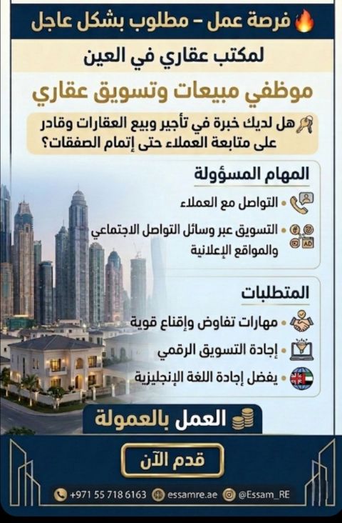 مطلوب فورا لمكتب عقارات في العين موظفين مبيعات وتسويق عقاري خبرة في تأجير وبيع العقارات وقادر على متابعة العملاء حتى اغلاق الصفقات التسويق عبر السوشيال ميديا ومواقع الاعلانات مهارات قوية في التفاوض والاقناع يفضل اجادة اللغة الانجليزية العمل بالعمولة