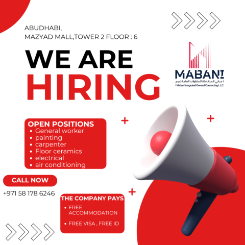 WE ARE HIRING Location Abu Dhabi - Mazyad Mall, Tower 2, Floor 6 We are looking for skilled workers in the following fields Painters Plastering Workers Air Conditioning Technicians What We Offer Free Accommodation Free Visa Free Emirates ID Stable Work Environment If you are interested, please contact us Apply Now and Join Our Team