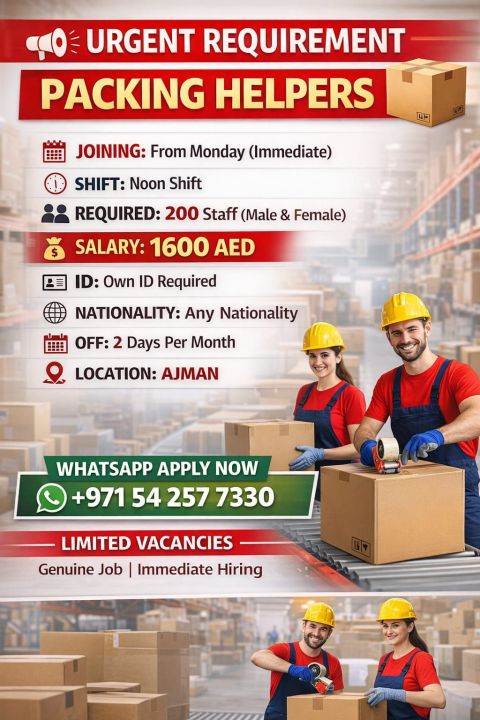 PACKING Helper (Male & Female) Salary AED1600 Nationality Any nationality Accommodation, Transportation, visa company Provided Location Marina Dubai Interested candidates contact