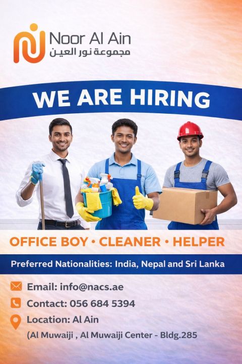 Opportunity Alert Noor Al Ain Group is looking for dedicated individuals to fill the following roles Cleaner, Helper, Office Boy, or Tea Boy. Location Al Muwaiji, Al Ain, Abu Dhabi We welcome applications from all qualified candidates. Ready to apply Contact us via