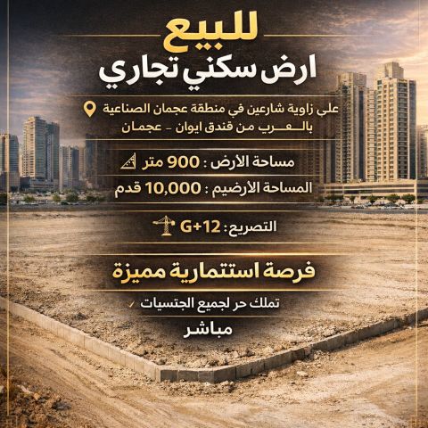 Residential/ commercial land for sale on a corner plot with two street frontages in the Ajman Industrial Area, behind the Ewan Hotel in Ajman. Land area 900 SQM (10000 square feet) Land consists of Permit G 12 Price AED4 million (negotiable) Freehold ownership for all nationalities. Direct sale