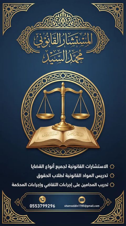 هل تبحث عن خبير قانوني يجمع بين الخبرة العملية والكفاءة الأكاديمية يسر المستشار القانوني محمد السيد أن يقدم لكم باقة متكاملة من الخدمات القانونية الاحترافية التي تلبي كافة احتياجاتكم، سواء كنتم أفرادا شركات طلابا في كلية الحقوق، أو محامين تحت التدريب. خدماتنا المتميزة 1. الاستشارات القانونية الشاملة نقدم استشارات معمقة ودقيقة في جميع أنواع القضايا (المدنية، التجارية، الجنائية الادارية الأحوال