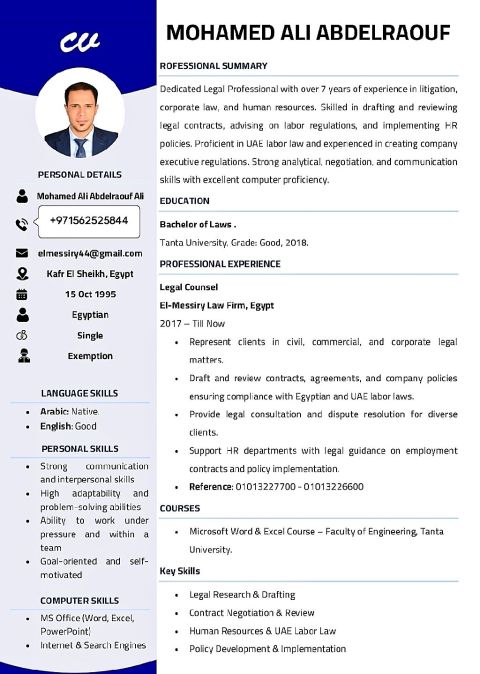 حاصل على ليسانس حقوق خبرة 10 سنوات داخل الدولة يوجد اقامة قابلة للإعارة رخصة قيادة اماراتية على دراية كاملة بكافة قوانين الدولة اجادة صياغة جميع المذكرات في القضايا التجارية المدنية أحوال شخصية القضايا العمالية القضايا الجزائية عملت بالعديد في مكاتب المحاماة داخل الدولة وكذا مستشار قانوني لبعض شركات المقاولات داخل الدولة وتحصيل الديون على دراية واسعة بسيستم المحاكم الاتحادية
