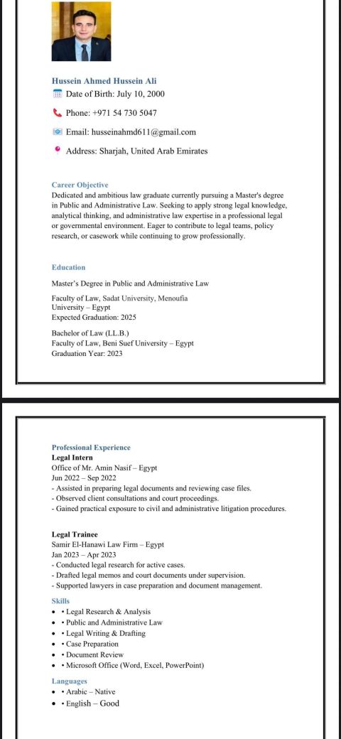 أنا محمد عبد الناصر محمد أبو زيد حاصل على ليسانس حقوق عام 2021 وبفضل الله تعالى وتوفيقه كنت من العشره الاوئل علي دفعتي طوال الأربع سنوات الدراسة بالاضافة الى أني حاصل على ماجستير في القانون العام والقانون الخاص ولديه خبرة في مجال المحاماة سنة ونصف في مصر وأمل أن احصل على فرصة في دولة الامارات لكي انطلق في مجالي وتخصصي أل أنا بحبة واعتز به والله ولي التوفيق