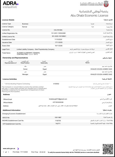 للبيع رخصة تجارية بامارة أبوظبي عمرها 7 سنوات. لا يوجد عليها عمال حاليا ولا أي التزامات أخرى. تصلح لأنشطة المقاولات والأعمال الفنية ومراكز التدريب والشركات المهتمة بالدخول في المناقصات