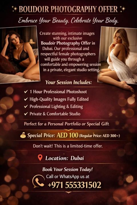 OFFER/ PROMOTIONAL STYLE All IN WhatsApp 400 Only 100% UAE Registered Company No Fake Offers No Freelancers Website Development FREE Logo Design Discount on. COM Domain FREE social media Marketing FREE 1 Year Basic Support FREE Backup & Migration FREE SSL Chat with us on WhatsApp NOW BOUDOIR PHOTOGRAPHY OFFER Professional Photoshoot 1 Hour Photoshoot Session - Only AED100 Private & Comfortable Studio