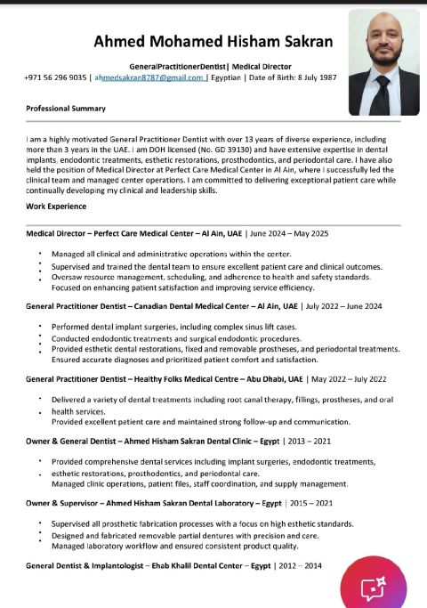 I am a well experienced doctor and clinic manager with 14 years of experience, 3 years inside UAE, excellent in implants, ortho, smiles, bridges, crowns and endo procedures with fair excellent experience
