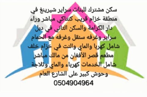 سكن مشترك للبنات سراير شامل النت والكهرباء والماء في منطقة خزام قريب من الشارع العام خلف دار الكرامة والسكن ثاني خلف سند اند سن فيها دبل سراير وغرفة مع حمام والأسعار من 350 الى 700 مباشر من مالك أم سيف