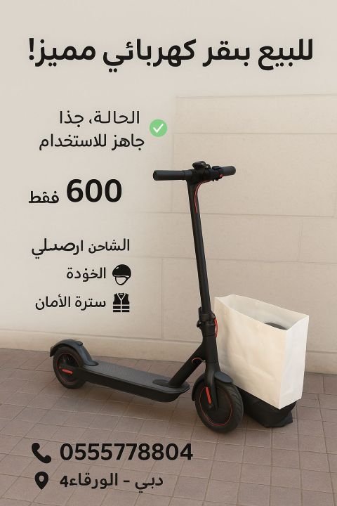 للبيع سكوتر كهربائي مميز الحالة نظيف جدا - جاهز للاستخدام السعر 600 درهم فقط يشمل المستلزمات التالية الشاحن الأصلي الخوذة سترة الأمان تصميم أنيق وأداء قوي بطارية تدوم لمسافة ممتازة للتواصل الموقع دبي - الورقاء 4